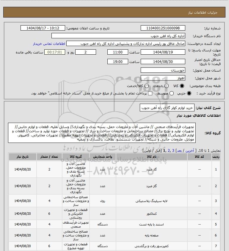 شرح کلی نیاز: خرید لوازم کولر گازی راه آهن جنوب