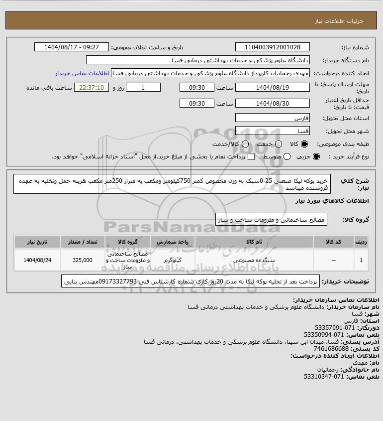 شرح کلی نیاز: خرید پوکه لیکا صنعتی 25-0سبک به وزن مخصوص کمتر 750کیلومتر ومکعب به متراژ 250متر مکعب هزینه حمل وتخلیه به عهده فروشنده میباشد