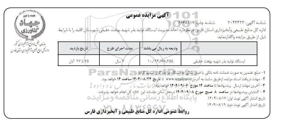 اداره کل منابع طبیعی و آبخیزداری استان فارس در نظر دارد احاله مدیریت ایستگاه تولید بذر شهید بهجت حقیقی شهرستان اقلید را با شرایط ذیل از طریق مزایده واگذار نماید.