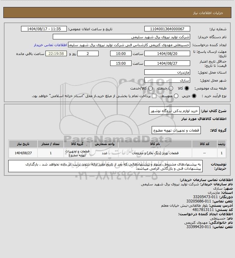 شرح کلی نیاز: خرید لوازم یدکی نیروگاه نوشهر