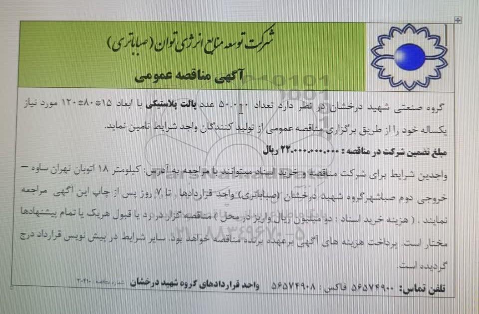 گروه صنعتی شهید درخشان در نظر دارد تعداد 50.000 عدد پالت پلاستیکی با ابعاد 15 * 80 * 120 مورد نیاز یکساله خود را از طریق برگزاری مناقصه عمومی و از تولید کنندگان واجد شرایط تامین نماید.