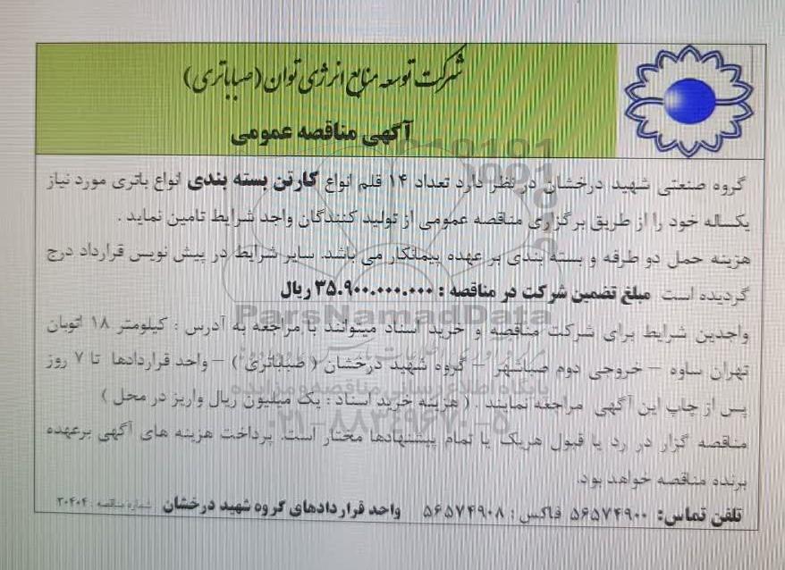 گروه صنعتی شهید درخشان در نظر دارد تعداد 14 قلم انواع کارتن بسته بندی انواع باتری مورد نیاز یکساله خود را از طریق برگزاری مناقصه عمومی و از تولید کنندگان واجد شرایط تامین نماید.