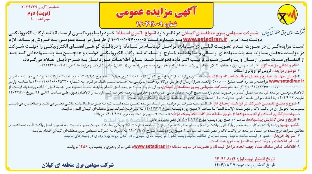 شرکت سهامی برق منطقه ای گیلان در نظر دارد انواع باتری اسقاط خود را با بهره گیری از سامانه تدارکات الکترونیکی دولت به آدرس ستاد ایران به شماره ثبت 1004001097000005 از طریق مزایده عمومی به فروش برساند لازم است مزایده گران در صورت عدم عضویت قبلی در سامانه مراحل ثبت نام در سامانه و دریافت گواهی امضای الکترونیکی را جهت شرکت در مزایده محقق سازند. به پیشنهادهای ارسالی و یا واصله خارج از سامانه تدارکات الکترونیکی دولت و همچنین به پیشنهادهایی که بعد از انقضای مدت مقرر ارسال و یا واصل شود ترتیب اثر داده نخواهد شد. سایر اطلاعات مورد نیاز به شرح ذیل اعلام میگردد