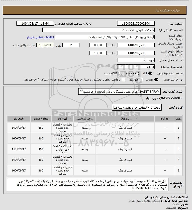 شرح کلی نیاز: PAINT SPRAY *صرفا تامین کنندگان بومی (آبادان و خرمشهر)*