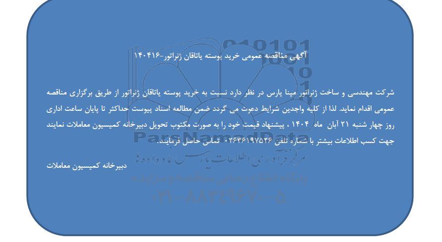 شرکت مهندسی و ساخت ژنراتور مپنا پارس در نظر دارد نسبت به خرید پوسته یاتاقان ژنراتور از طریق برگزاری مناقصه عمومی اقدام نماید. لذا از کلیه واجدین شرایط دعوت می گردد ضمن مطالعه اسناد پیوست حداکثر تا پایان ساعت اداری روز چهارشنبه 21 آبان ماه 1404 ، پیشنهاد قیمت خود را به صورت مکتوب تحویل دبیرخانه کمیسیون معاملات نمایند. جهت کسب اطلاعات بیشتر با شماره تلفن 02636197526 تماس حاصل فرمایند.