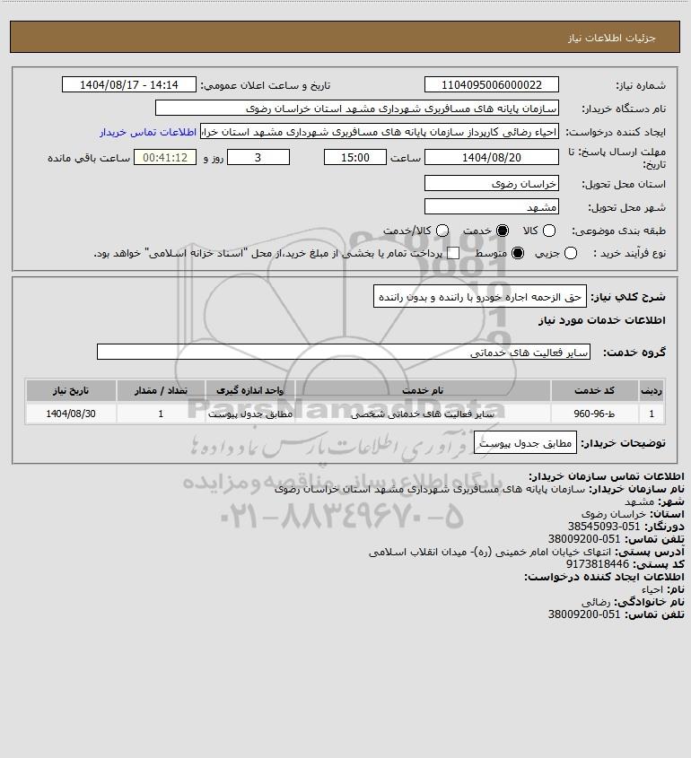 شرح کلی نیاز: حق الزحمه اجاره خودرو با راننده و بدون راننده