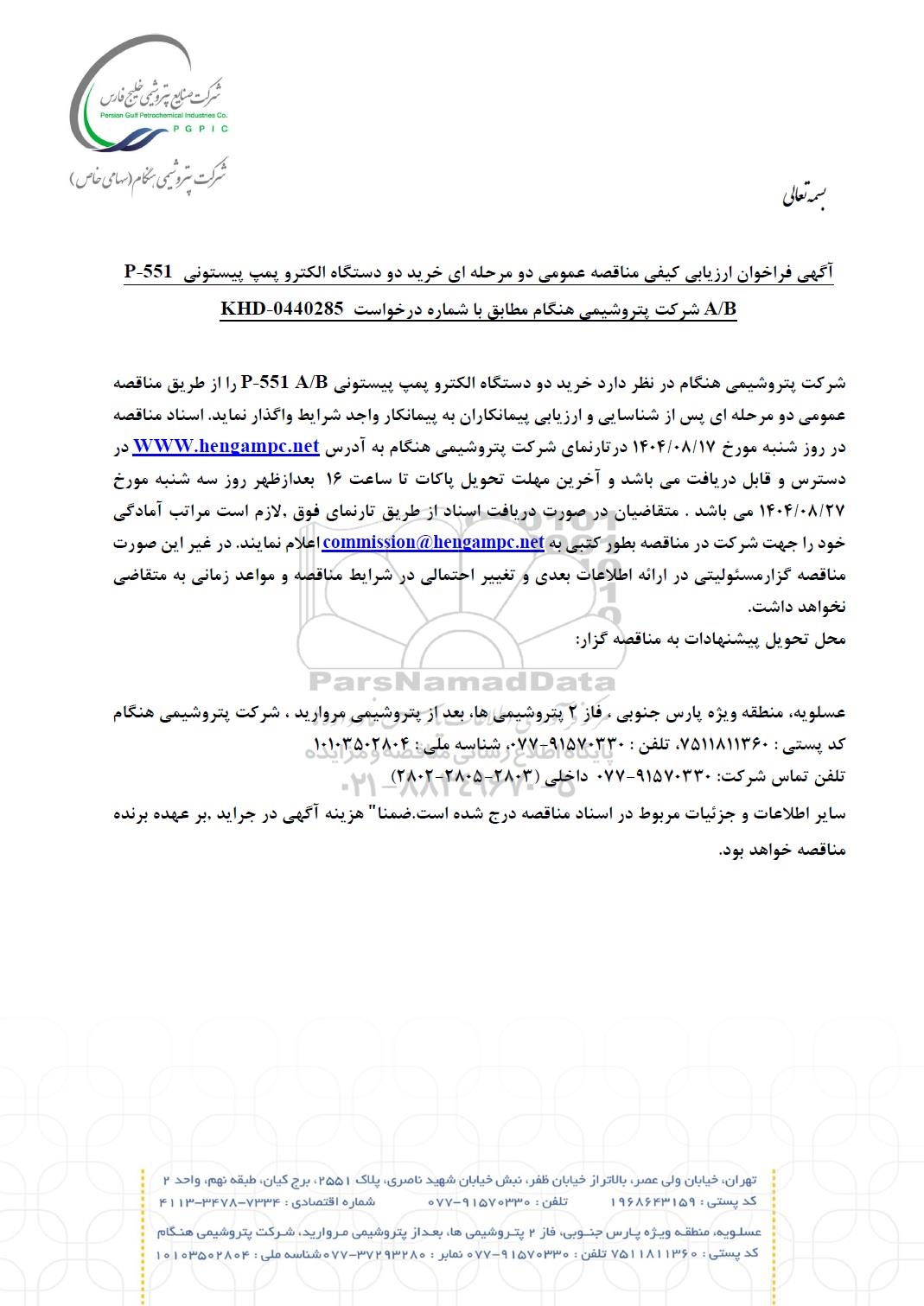 شرکت پتروشیمی هنگام در نظر دارد خرید دو دستگاه الکتروپمپ پیستونی P-551 A/B را از طریق مناقصه عمومی دو مرحله ای پس از شناسایی و ارزیابی پیمانکاران به پیمانکار واجد شرایط واگذار نماید. اسناد مناقصه در روز شنبه مورخ 1404.08.17 در تارنمای شرکت پتروشیمی هنگام به آدرس WWW.hengampc.net در دسترس و قابل دریافت می باشد و آخرین مهلت تحویل پاکات تا ساعت 16 بعدازظهر روز سه شنبه مورخ 1404.08.27 می باشد. متقاضیان در صورت دریافت اسناد از طریق تارنمای فوق، لازم است مراتب آمادگی خود را جهت شرکت در مناقصه به طور کتبی به commission@hengampc.net اعلام نمایند. در غیر این صورت مناقصه گذار مسئولیتی در ارائه اطلاعات بعدی و تغییر احتمالی در شرایط مناقصه و مواعد زمانی به متقاضی نخواهد داشت.