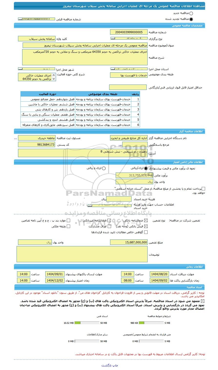 | عنوان/موضوع مناقصه | مناقصه عمومی یک مرحله ای عملیات اجرایی سامانه پخش سیلاب شهرستان نیمروز | |||||||||||||||||||||||
