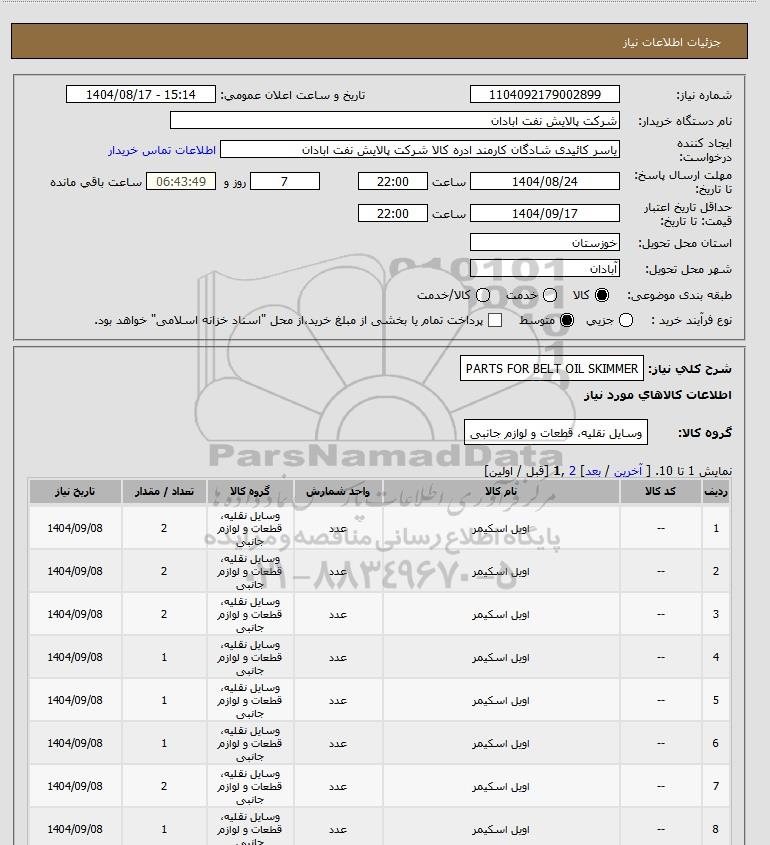 شرح کلی نیاز: PARTS FOR BELT OIL SKIMMER