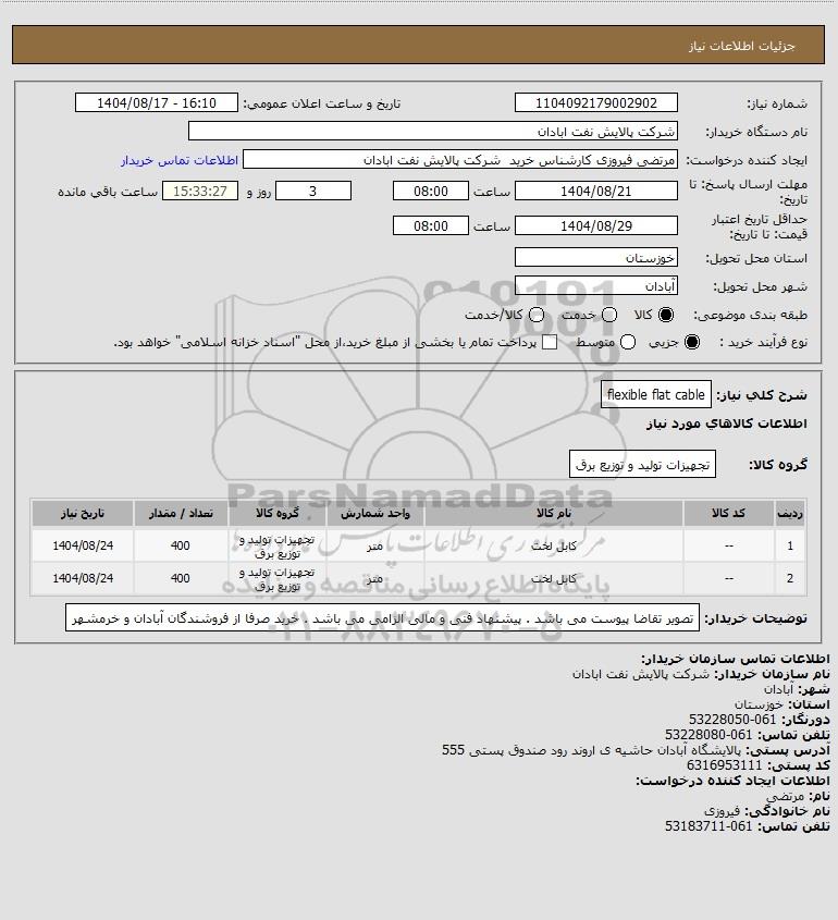 | 2 | -- | کابل لخت | متر | تجهیزات تولید و توزیع برق | 400 | 1404/08/24 |