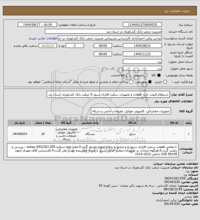 شرح کلی نیاز: استعلام قیمت خرید قطعات و تجهیزات سخت افزاری سرور A شعب بانک کشاورزی استان یزد