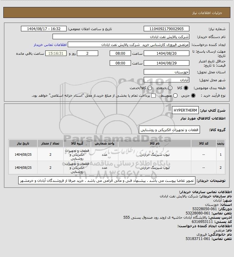 | 1 | -- | تیوب شیرینگ حرارتی | عدد | قطعات و تجهیزات الکتریکی و روشنایی | 2 | 1404/08/25 |