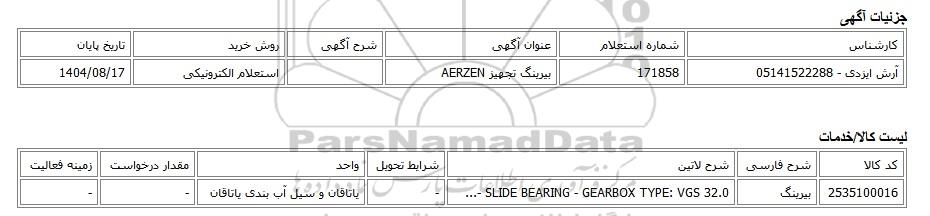 آرش ایزدی - 05141522288171858بیرینگ تجهیز AERZENاستعلام الکترونیکی1404/08/17