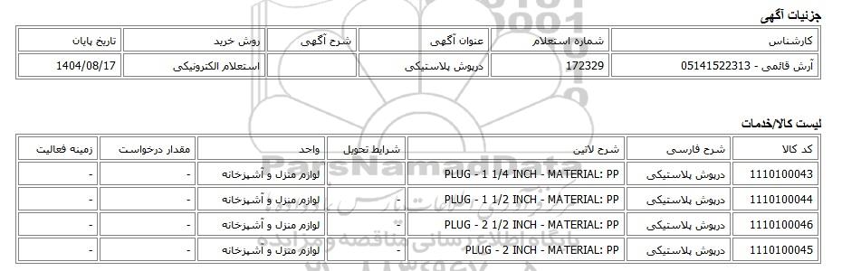 | آرش قائمی - 05141522313 | 172329 | درپوش پلاستیکی | استعلام الکترونیکی | 1404/08/17 |