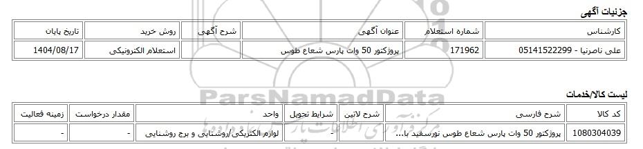 استعلام الکترونیکی پروژکتور 50 وات پارس شعاع طوس, استعلام الکترونیکی، پروژکتور 50 وات پارس شعاع طوس