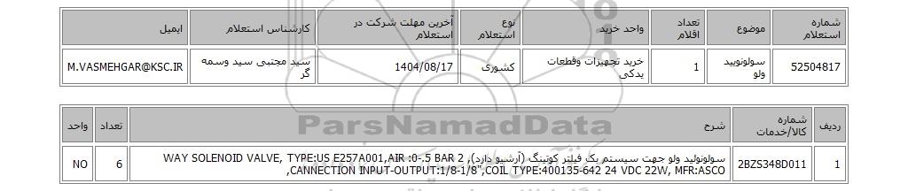 52504817سولونویید ولو1خرید تجهیزات وقطعات یدکیکشوری1404/08/17سید مجتبی سید وسمه گرM.VASMEHGAR@KSC.IR