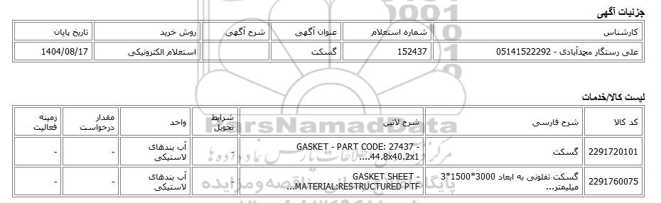 | علی رستگار محمدآبادی - 05141522292 | 152437 | گسکت | استعلام الکترونیکی | 1404/08/17 |