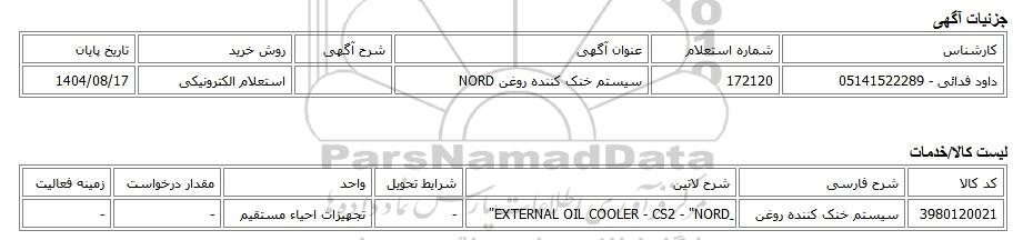 | داود فدائی - 05141522289 | 172120 | سیستم خنک کننده روغن NORD | استعلام الکترونیکی | 1404/08/17 |