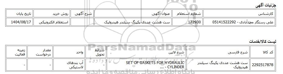 | علی رستگار محمدآبادی - 05141522292 | 172930 | ست هشت عددی پکینگ سیلندر هیدرولیک | استعلام الکترونیکی | 1404/08/17 |