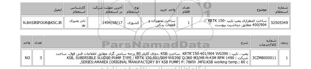 52505349ساخت اضطراری پمپ تایپ KRTK 150-400/904 مطابق دیتاشیت پیوست1ساخت تجهیزات و قطعات یدکیکشوری1404/08/17نادر بصیری پورN.BASIRIPOUR@KSC.IR