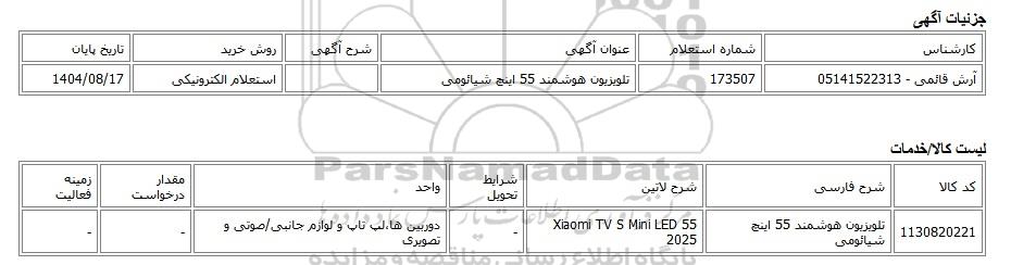 | آرش قائمی - 05141522313 | 173507 | تلویزیون هوشمند 55 اینچ شیائومی | استعلام الکترونیکی | 1404/08/17 |