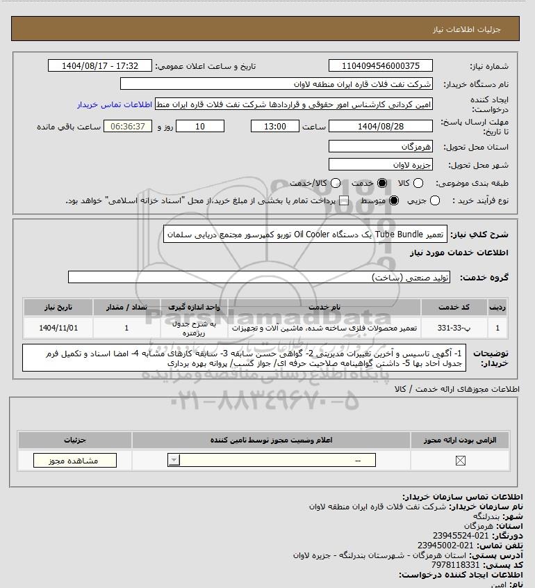 شرح کلی نیاز: تعمیر Tube Bundle یک دستگاه Oil Cooler توربو کمپرسور مجتمع دریایی سلمان