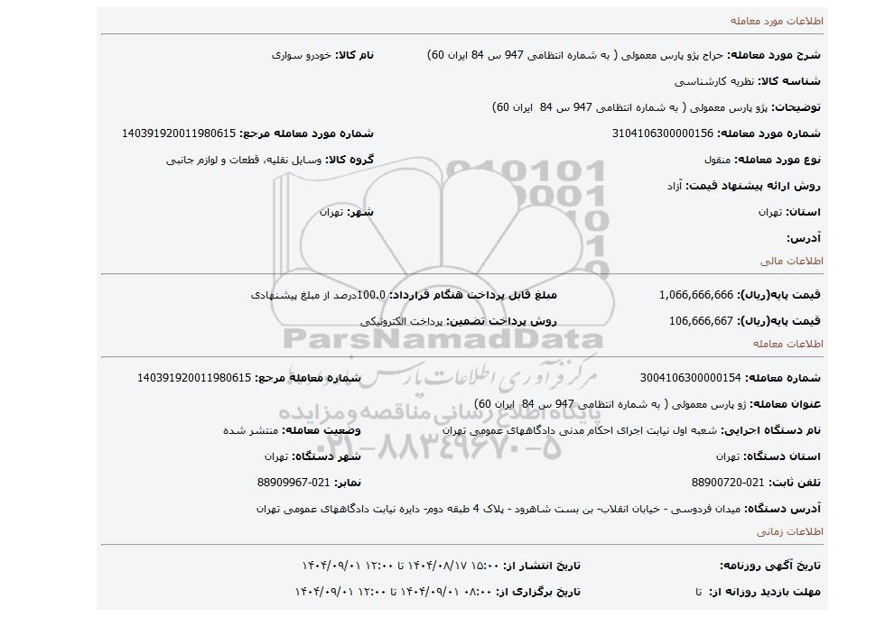 | شرح مورد معامله: حراج پژو پارس معمولی ( به شماره انتظامی 947 س 84 ایران 60) | نام کالا: خودرو سواری | |