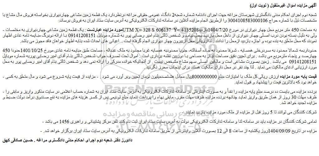 شعبه دوم اجرای احکام مدنی دادگستری شهرستان مراغه جهت اجرای دادنامه شماره شعبه2 دادگاه عمومی حقوقی مراغه درنظردارد یک قطعه زمین مشاعی چهاردیواری بخواسته فروش مال مشاع با مشخصات ذیل با شماره حراج 3004108583000106 را ازطریق انجام مزایده آنلاین در سامانه تدارکات الکترونیکی به آدرس سایت ستاد ایران به فروش برساند: