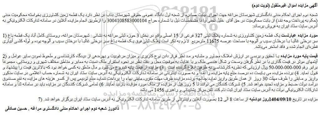 شعبه دوم اجرای احکام مدنی دادگستری شهرستان مراغه جهت اجرای نیابت صادره از شعبه اول دادگاه عمومی حقوقی شهرستان بناب در نظر دارد یک قطعه زمین کشاورزی بخواسته محکومیت مدنی (حکم به پرداخت وجه نقد) از بابت محکومیت در حق آقای  خلیل نجفی را با مشخصات ذیل با شماره حراج 3004108583000104 را ازطریق انجام مزایده آنلاین در سامانه تدارکات الکترونیکی به آدرس سایت ستاد ایران به فروش برساند: