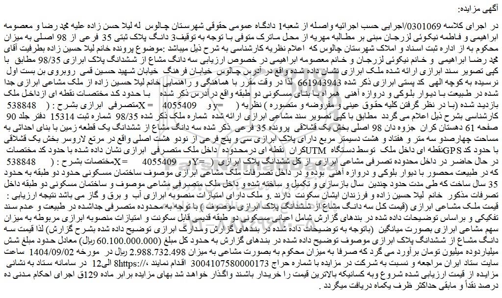 در اجرای کلاسه 0301069/اجرایی حسب اجرائیه واصله از شعبه1 دادگاه عمومی حقوقی شهرستان چالوس  له لیلا حسن زاده علیه محمد رضا و معصومه ابراهیمی و فاطمه نیکوئی لزرجان مبنی بر مطالبه مهریه از محل ماترک متوفی با توجه به توقیف3 دانگ پلاک ثبتی 35 فرعی از 98 اصلی به میزان محکوم به از اداره ثبت اسناد و املاک شهرستان چالوس که  اعلام نظریه کارشناسی به شرح ذیل میباشد :موضوع پرونده خانم لیلا حسین زاده بطرفیت آقای محمد رضا ابراهیمی  و خانم نیکوئی لزرجان و خانم معصومه ابراهیمی در خصوص ارزیابی سه دانگ مشاع از ششدانگ پلاک ابرازی 98/35 مطابق  با کپی تصویر سند ابرازی ارائه شده ملک ابرازی نشان داده شده واقع در آدرس چالوس  خیابان فرهنگ  خیابان شهید حسین قمی  روبروی بن بست اول  نرسیده به کوچه الهی  کد پستی ابرازی ذکر شده 661943943  لذا در وقت مقرر با هماهنگی و راهنمایی خانم لیلا حسین زاده از ملک مشاعی ابرازی جدا شده در طبیعت با دیوار بلوکی و دروازه آهنی  همراه با بنای مسکونی دو طبقه واقع درآدرس ذکر شده    با حدود کد مختصات نقطه ای ازداخل ملک متصرفی  ابرازی بشرح : (    538848 x=    و    4055409y=    ) بازدید شده (با در نظر گرفتن کلیه حقوق عینی و مفروضه و متصوره ) نظریه کارشناسی بشرح ذیل اعلام می گردد  مطابق با کپی تصویر سند مشاعی ابرازی ارائه شده  شماره ملک ذکر شده 98/35  شماره ثبت 15314  دفتر جلد 90  صفحه 61 دهستان کران  جزوه دان 98 اصلی بخش یک قشلاقی  پرونده 35 فرعی  ذکر شده سه دانگ مشاع از ششدانگ یک قطعه زمین با بنای احداثی به مساحت چهارصدو سه متر و هفتاد و هشت دسیمتر مربع دارای پلاک ابرازی سی و پنج فرعی از نودو هشت اصلی واقع در مرتع لاروسر بخش یک قشلاقی کران  نقطه ای درمحدوده  داخل ملک متصرفی  ابرازی نشان داده شده با حدود کد مختصات utm نقطه ای داخل ملک  توسط دستگاه gps با حدود کد مختصات بشرح : (      538848 x=    و    4055409  y=  )  در حال حاضر در داخل محدوده تصرفی مشاعی ابرازی  از کل ششدانگ پلاک ابرازی که در طبیعت محصور با دیوار بلوکی و دروازه آهنی  بوده و در داخل تصرفات ملک مشاعی ابرازی موصوف ساختمان مسکونی حدود دو طبقه به حدود 35 سال ساخت که طی مدت حدود چندین  سال بازسازی و تکمیل و ساخته شده و داخل ملک متصرفی مشاعی موصوف و ساختمان مسکونی دو طبقه داخل تصرفات مذکور  خانم  لیلا حسین زاده و فرزندان ایشان سکونت  دارند .و ملک دارای امتیازات منصوبه ابرازی آب  و برق و گاز می باشد نتیجه ارزیابی :  قیمت ملک مشاعی ابرازی (قیمت کل سه دانگ مشاع از ششدانگ پلاک ابرازی موصوف ) با توجه به محدوده متصرفی جداشده در طبیعت و عدم سند تفکیکی و براساس توضیحات داده شده در بندهای گزارش شامل اعیانی مسکونی دو طبقه قدیمی قابل سکونت و امتیازات منصوبه ابرازی مربوطه به میزان سهم مشاعی ابرازی بصورت میانگین  (باتوجه به توضیحات داده شده در بندهای گزارش ومدارک ابرازی توضیح داده شده بشرح گزارش) لذا قیمت سه دانگ مشاع از ششدانگ پلاک ابرازی موصوف توضیح داده شده در بندهای گزارش به حدود کل مبلغ (60.100.000.000 ریال) معادل حدود مبلغ شش میلیاردوده میلیون تومان برآورد می گرد که صرفا به میزان محکوم به بصورت مشاعی به میزان 2.988.732.498 ریال در  مورخه 1404/09/02  ساعت 8 الی12  در سامانه ستاد به نشانی سایت ستاد ایران مراجعه و نسبت به شرکت در مزایده با شماره حراج 3004107580000173  اقدام نمایند ، مزایده از قیمت ارزیابی شده شروع وبه کسانیکه بالاترین قیمت را خریدار باشند واگذار خواهد شد بهای مزایده برابر ماده 129ق اجرای احکام مدنی ده درصد نقداً و مابقی حداکثر ظرف یکماه دریافت میگردد .
