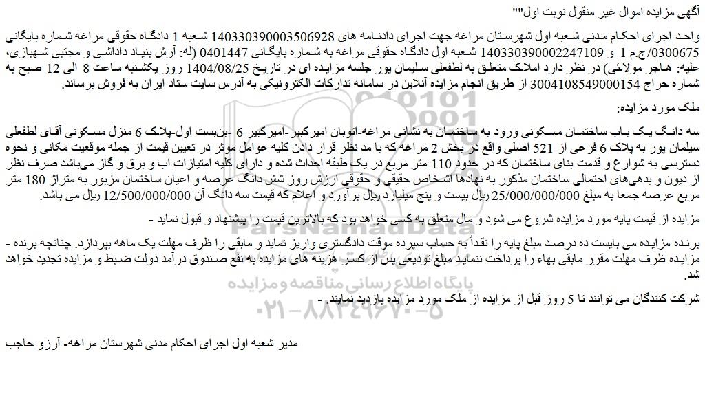 واحد اجرای احکام مدنی شعبه اول شهرستان مراغه جهت اجرای دادنامه های 140330390003506928 شعبه 1 دادگاه حقوقی مراغه شماره بایگانی 0300675/ج.م 1 و 140330390002247109 شعبه اول دادگاه حقوقی مراغه به شماره بایگانی 0401447 (له: آرش بنیاد داداشی و مجتبی شهبازی، علیه: هاجر مولائی) در نظر دارد املاک متعلق به لطفعلی سلیمان پور جلسه مزایده ای در تاریخ 1404/08/25 روز یکشنبه ساعت 8 الی 12 صبح به شماره حراج 3004108549000154 از طریق انجام مزایده آنلاین در سامانه تدارکات الکترونیکی به آدرس سایت ستاد ایران به فروش برساند.