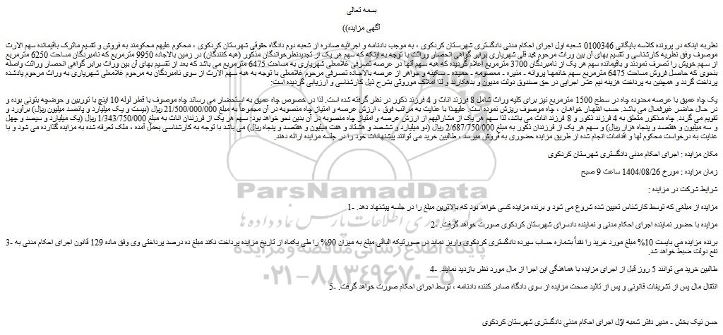 یک چاه عمیق با عرصه محدوده چاه در سطح 1500 مترمربع نیز برای کلیه وراث شامل 8 فرزند اناث و 4 فرزند ذکور در نظر گرفته شده است. لذا در خصوص چاه عمیق به استحضار می رساند چاه موصوف با قطر لوله 10 اینچ با توربین و حوضچه بتونی بوده و در حال حاضر غیرفعال می باشد. حسب اظهار خواهان ، چاه موصوف ریزش نموده است. علیهذا با عنایت به مراتب فوق ، ارزش عرصه و امتیاز چاه منصوبه در آن مجموعاً به مبلغ 21/500/000/000 ریال (بیست و یک میلیارد و پانصد میلیون ریال) برآورد و تقویم می گردد. چاه مذکور متعلق به 4 فرزند ذکور و 8 فرزند اناث می باشد، لذا سهم هر یک از مشارالیهم از ارزش عرصه و امتیاز چاه منصوبه در آن بدین نحو خواهد بود: سهم هر یک از فرزندان اناث به مبلغ 1/343/750/000 ریال (یک میلیارد و سیصد و چهل و سه میلیون و هفتصد و پنجاه هزار ریال) و سهم هر یک از فرزندان ذکور به مبلغ 2/687/750/000 ریال (دو میلیارد و ششصد و هشتاد و هفت میلیون و هفتصد و پنجاه ریال) می باشد با توجه به کارشناسی بعمل آمده ، ملک تعرفه شده به مزایده گذارده می شود و با عنایت به درخواست محکوم لها و اقدامات انجام شده از طریق مزایده حضوری به فروش میرسد ، طالبین خرید می توانند پیشنهادات خود را در جلسه مزایده ارائه دهند.
