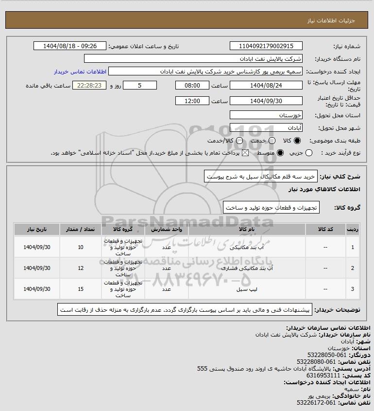 شرح کلی نیاز: خرید سه قلم مکانیکال سیل به شرح پیوست
