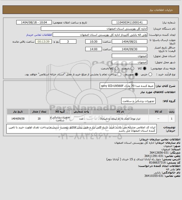 شرح کلی نیاز: ضبط کننده صدا 20 مارک sony ICD-UX560F