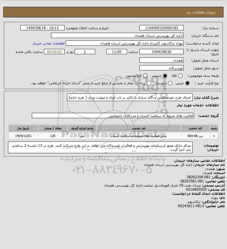 شرح کلی نیاز: اجرای طرح خودمراقبتی و آگاه سازی با تاکید بر تاب آوری و مهارت ورزی ( طرح خاتم)