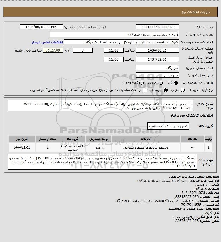 استعلام بها و موضوع استعلام استعلام بابت خرید یک عدد دستگاه غربالگری شنوایی نوزادان( دستگاه اتواکوستیک امیژن اسکرینگ با قابلیت AABR Screening *DPOOAE*TEOAE مطابق با شاخص پیوست به اطلاع کلیه شرکتها و افراد متخصص واجد شرایط میرساند، آگهی گذار در نظر دارد از طریق استعلام بها، نسبت به انتخاب و دریافت پیشنهادات اقدام نماید. این استعلام با کد آگهی ثبت شده در سامانه خبرگزاری پارس نماد : 9822273 منتشر شده است. مشخصات استعلام : تاریخ شروع استعلام: 1404/08/18 آخرین مهلت ارسال پیشنهاد قیمت : 1404/08/21 و محل اجرای پروژه : استان مناقصات استان هرمزگان میباشد. استعلام قیمت مورد درخواست : استعلام بابت خرید یک عدد دستگاه غربالگری شنوایی نوزادان( دستگاه اتواکوستیک امیژن اسکرینگ با قابلیت AABR Screening *DPOOAE*TEOAE مطابق با شاخص پیوست با دستهبندیهای تخصصی و گروه های مرتبط : خدمات و تجهیزات آزمایشگاهی و پزشکی, استعلام اطلاع رسانی میگردد.