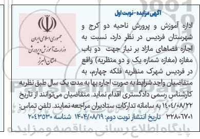 اداره آموزش و پرورش ناحیه دو کرج و شهرستان فردیس در نظر دارد نسبت به اجاره فضاهای مازاد بر نیاز جهت دو باب مغازه (مغازه شماره یک و دومنظریه) واقع در فردیس شهرک منظریه فلکه چهارم ،به متقاضیان واجد شرایط که دارای مجوز می باشند به صورت اجاره بها به مدت یک سال طبق نظریه کارشناس رسمی دادگستری اقدام نماید. متقاضیان میتوانند از تاریخ 1404.8.22 به سامانه تدارکات ستادیران مراجعه نمایند.