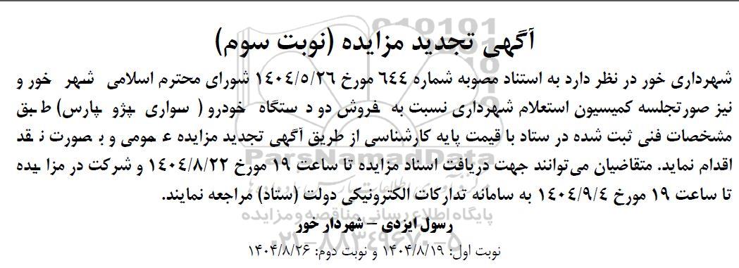 شهرداری خور در نظر دارد به استناد مصوبه شماره 644 مورخ 1404.05.26 شورای محترم اسلامی شهر خور و نیز صورتجلسه  کمیسیون استعلام شهرداری نسبت به فروش دو دستگاه خودرو (سواری پژو پارس) طبق مشخصات فنی ثبت شده در ستاد با قیمت پایه کارشناسی از طریق آگهی تجدید مزایده عمومی و بصورت نقد اقدام نماید. متقاضیان می توانند جهت دریافت اسناد مزایده تا ساعت 19 مورخ 1404.08.22 و شرکت در مزایده تا ساعت 19 مورخ 1404.09.4 به سامانه تدارکات الکترونیکی دولت (ستاد) مراجعه نمایند.