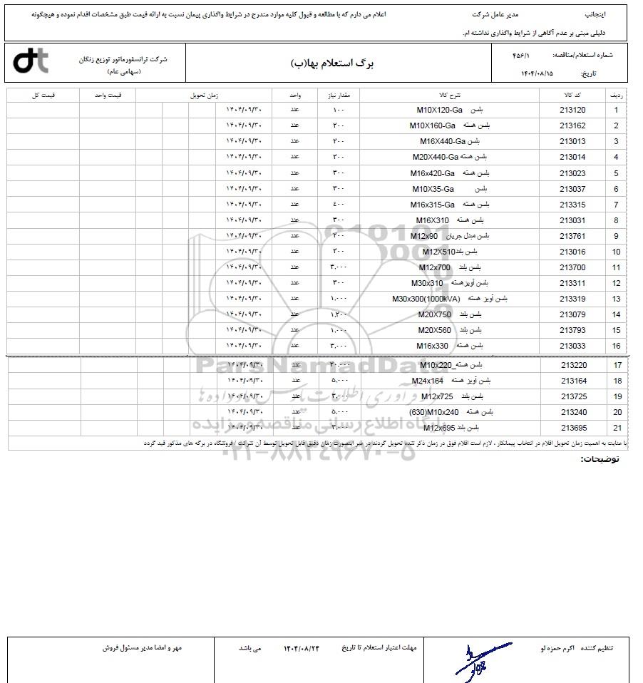 | 21 | 213695 | بلسن بلند M12 * 695 | 3.000 | عدد | 1404.09.30 |