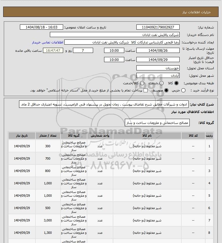 | 9 | -- | شیر مخلوط (دو حالته) | عدد | مصالح ساختمانی و ملزومات ساخت و ساز | 1,000 | 1404/09/29 |