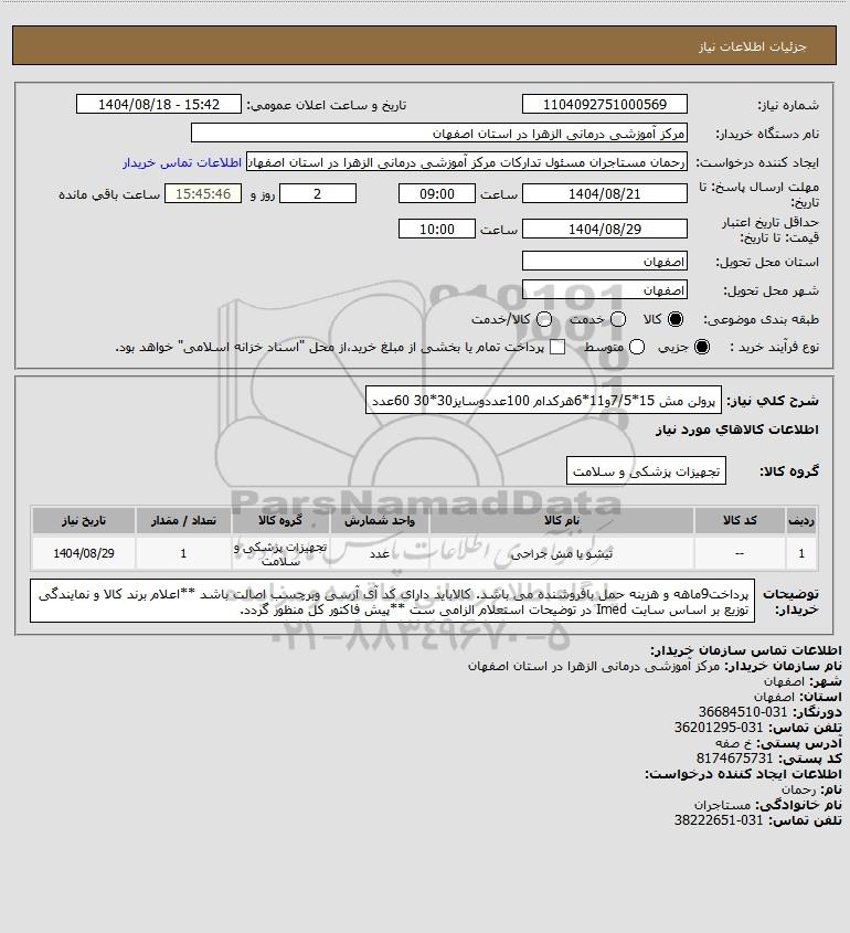 شرح کلی نیاز: پرولن مش 15*7/5و11*6هرکدام 100عددوسایز30*30 60عدد