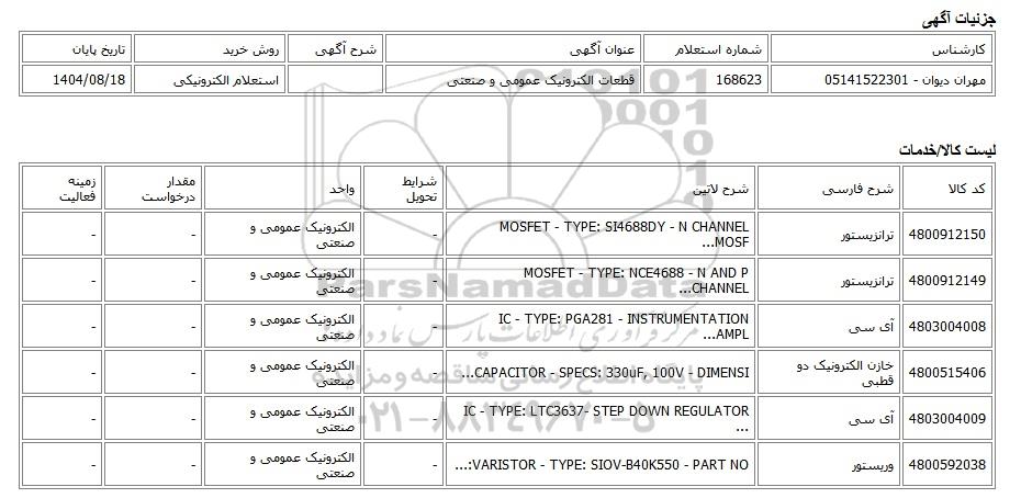 مهران دیوان - 05141522301168623قطعات الکترونیک عمومی و صنعتیاستعلام الکترونیکی1404/08/18