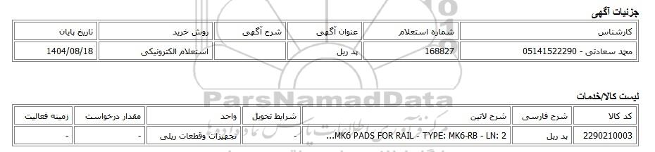 | محمد سعادتی - 05141522290 | 168827 | پد ریل | استعلام الکترونیکی | 1404/08/18 |