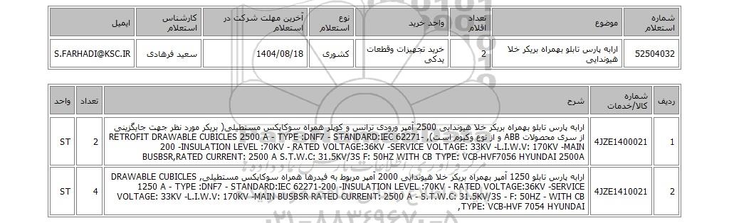استعلام ارابه پارس تابلو بهمراه بریکر خلا هیوندایی, استعلام ارابه پارس تابلو بهمراه بریکر خلا هیوندایی