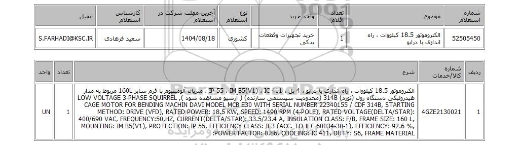 | 52505450 | الکتروموتور 18.5 کیلووات ، راه اندازی با درایو | 1 | خرید تجهیزات وقطعات یدکی | کشوری | 1404/08/18 | سعید فرهادی | S.FARHADI@KSC.IR |