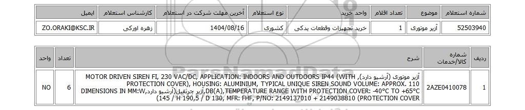 | 52503940 | آزیر موتوری | 1 | خرید تجهیزات وقطعات یدکی | کشوری | 1404/08/16 | زهره اورکی | ZO.ORAKI@KSC.IR |