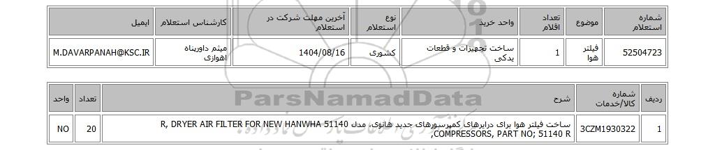 | 52504723 | فیلتر هوا | 1 | ساخت تجهیزات و قطعات یدکی | کشوری | 1404/08/16 | میثم داورپناه اهوازی | M.DAVARPANAH@KSC.IR |