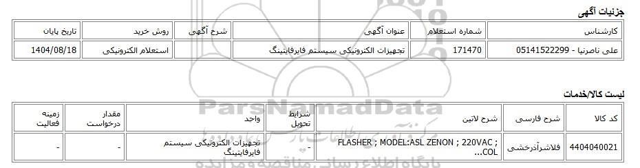| علی ناصرنیا - 05141522299 | 171470 | تجهیزات الکترونیکی سیستم فایرفایتینگ | استعلام الکترونیکی | 1404/08/18 |
