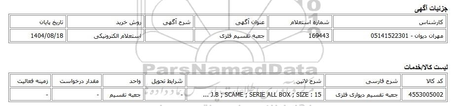 مهران دیوان - 05141522301169443جعبه تقسیم فلزیاستعلام الکترونیکی1404/08/18