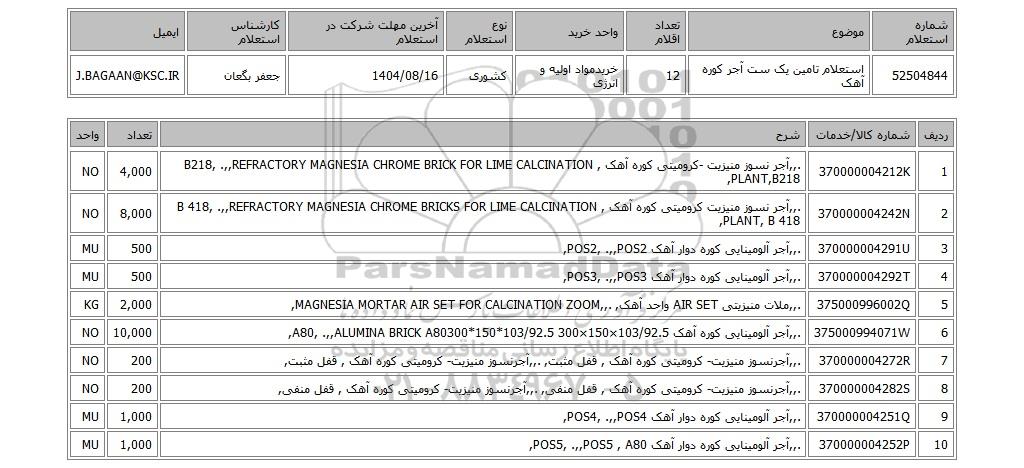 | 52504844 | استعلام تامین یک ست آجر کوره آهک | 12 | خریدمواد اولیه و انرژی | کشوری | 1404/08/16 | جعفر بگعان | J.BAGAAN@KSC.IR |